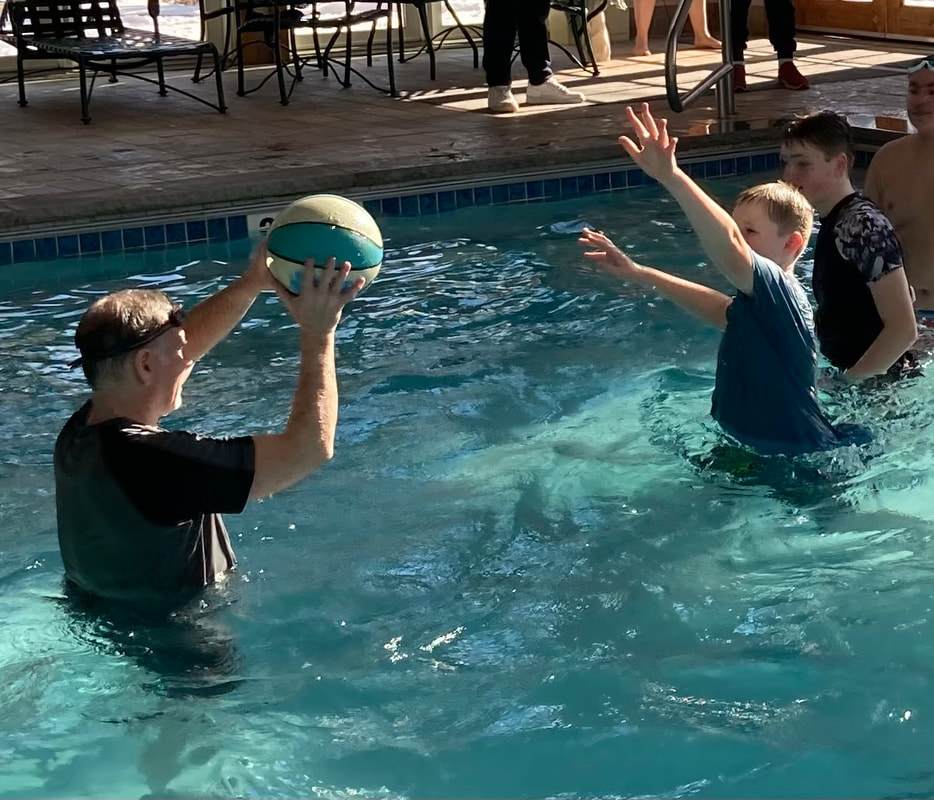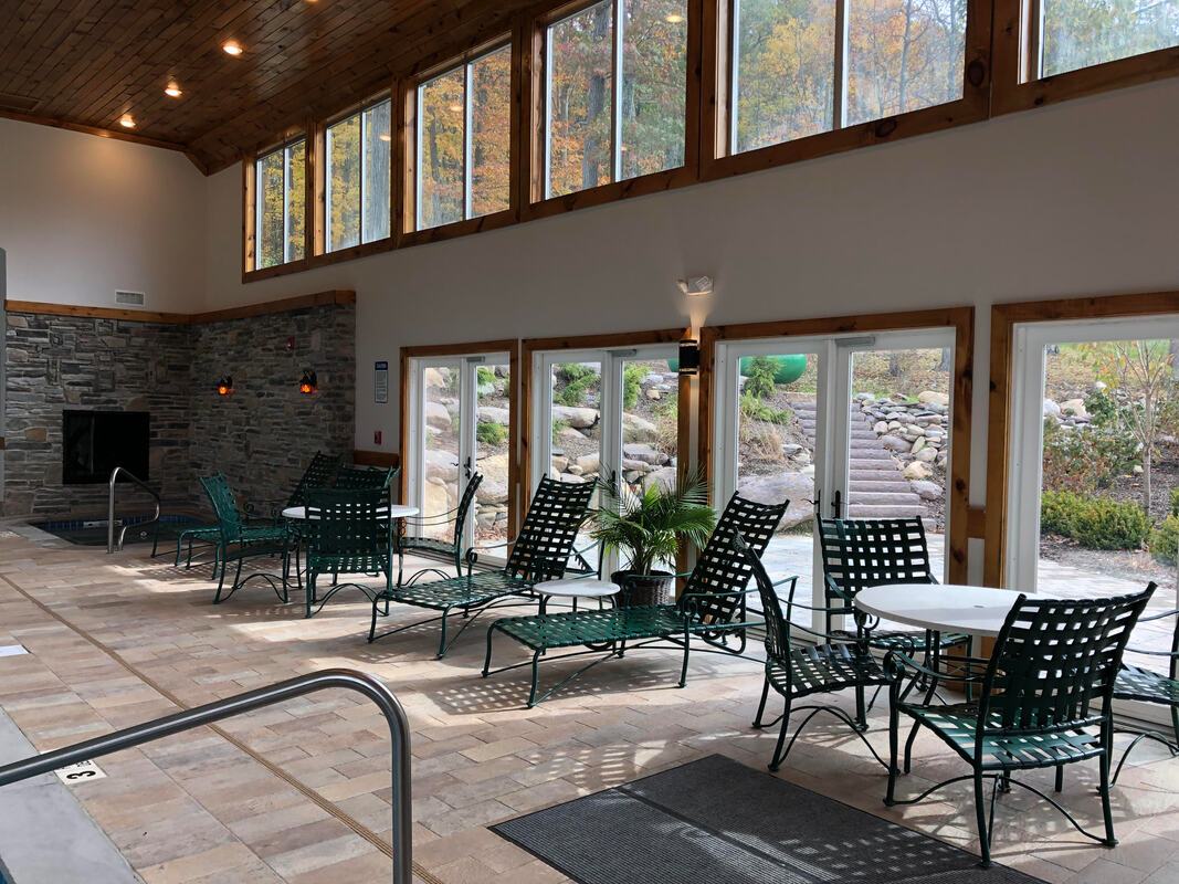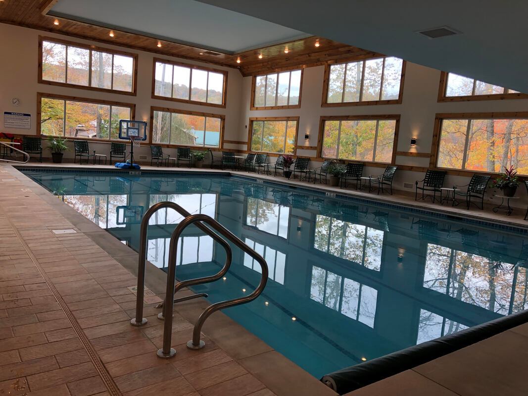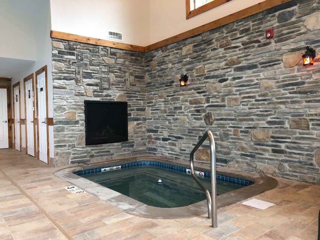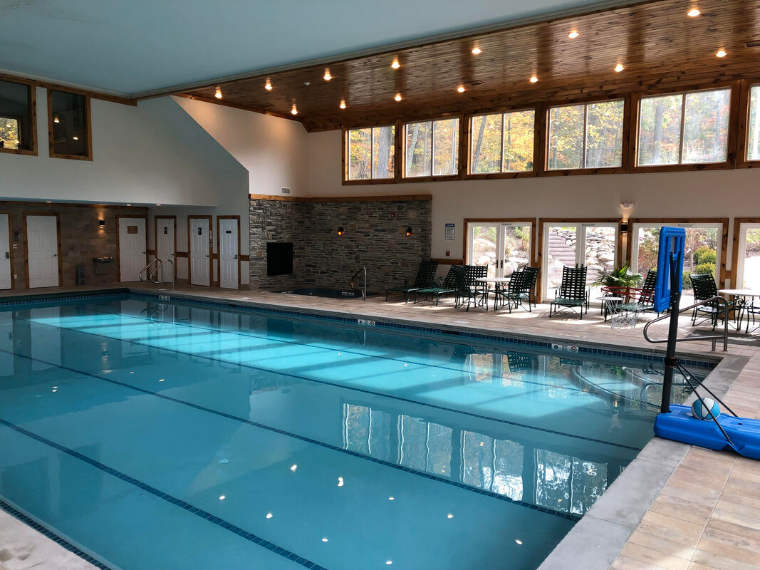 Features a shallow water pool, 3-5 feet deep, colorful lighting in the water and on the ceiling, a basketball hoop & option to set up a volleyball net. Off to the side is heated spa with jets & a fireplace for relaxing. Around the pool deck are tables & chairs, and doors that open up to an outdoor patio overlooking the Shiloh Pond.